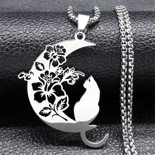 Collier Pendentif Chat Lune Fleurie